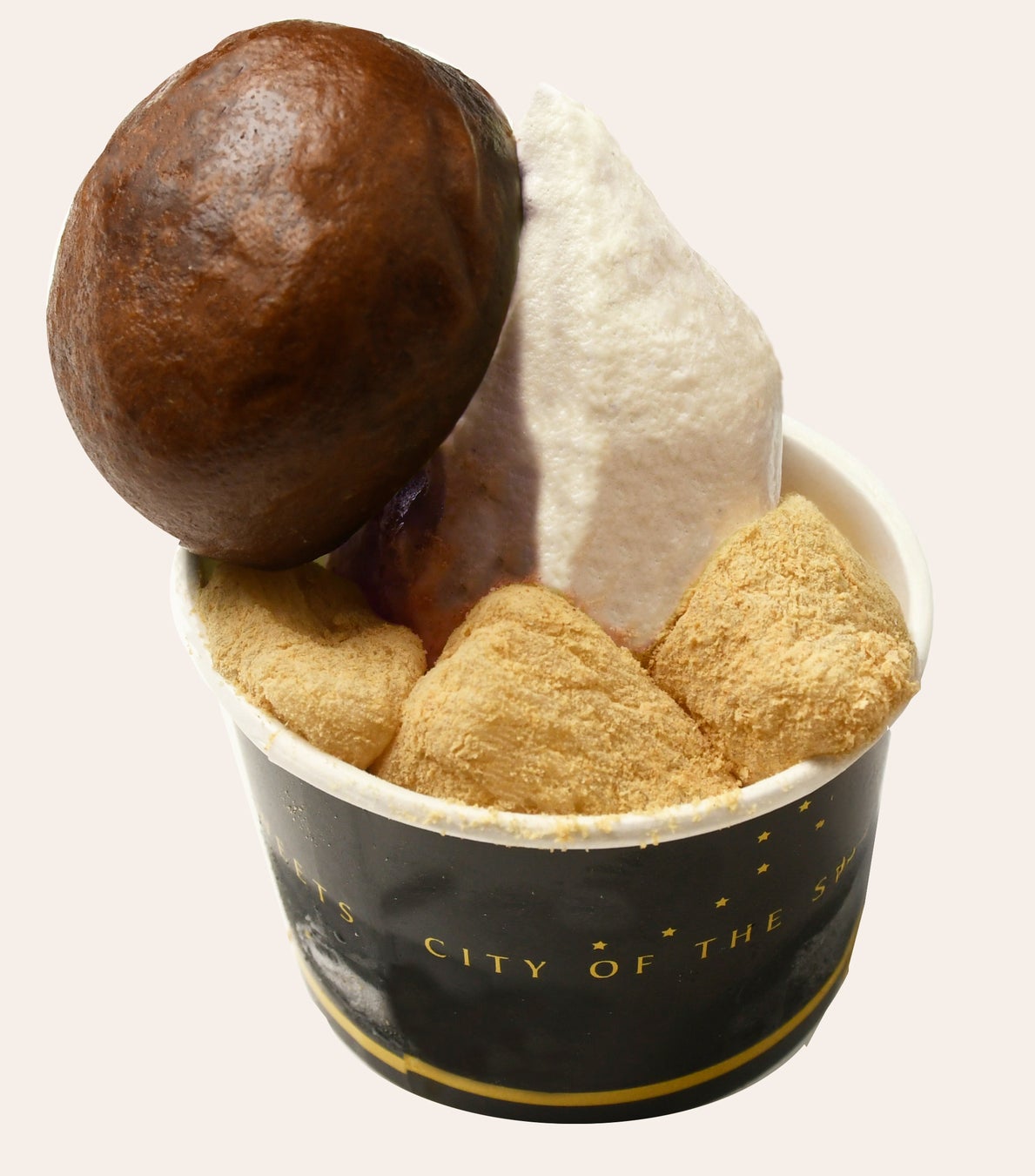 あいぱく新登場!2015年の開催当初から不動の人気を誇る『桔梗屋』から待望の新商品が登場。老舗和菓子店ならではの技が光る新作は、バニラアイスに桔梗信玄棒(きなこ棒)を贅沢に混ぜ合わせた、最旬の"ハイブリッドアイス"。さらに、外はカリッとした食感が楽しめる「桔梗信玄餅万寿」を1個トッピング。贅沢な風味と食感のハーモニーをご堪能ください。