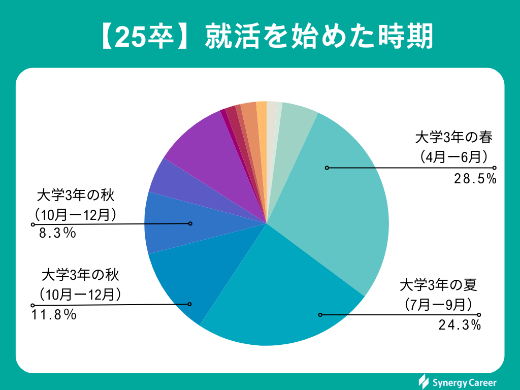 25卒では「大学3年の春」(28.5%)が最も多いという結果になりました。この調査で約7割のの学生が大学3年生時に就活を始めていることが分かります。