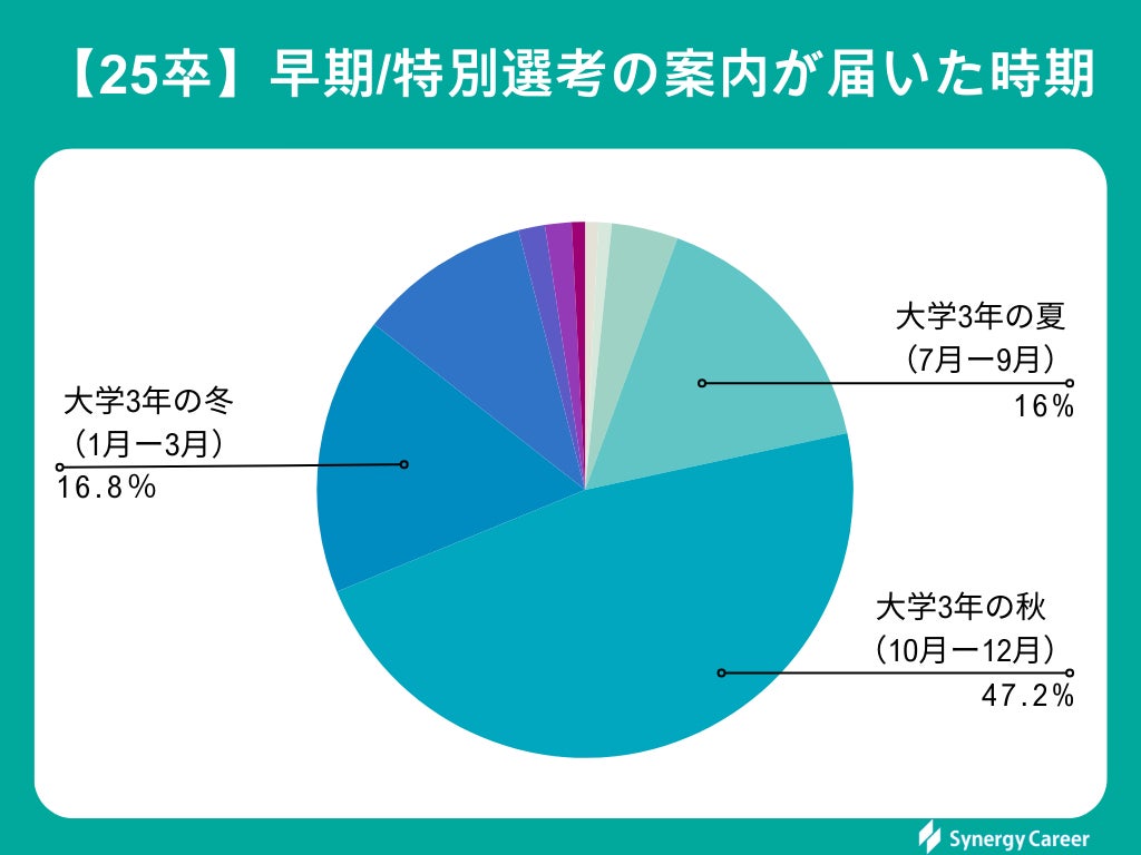 早期選考・特別選考のお知らせは、「大学生の秋以降」に受け取ることが多いようです。25卒では「大学3年の春」(28.5%)が就活を始める時期として、最も多いという結果が出ています。そのため、「大学3年の春、夏」に早期選考/特別選考のお知らせを公開すれば、より多くの学生の獲得につながるでしょう。