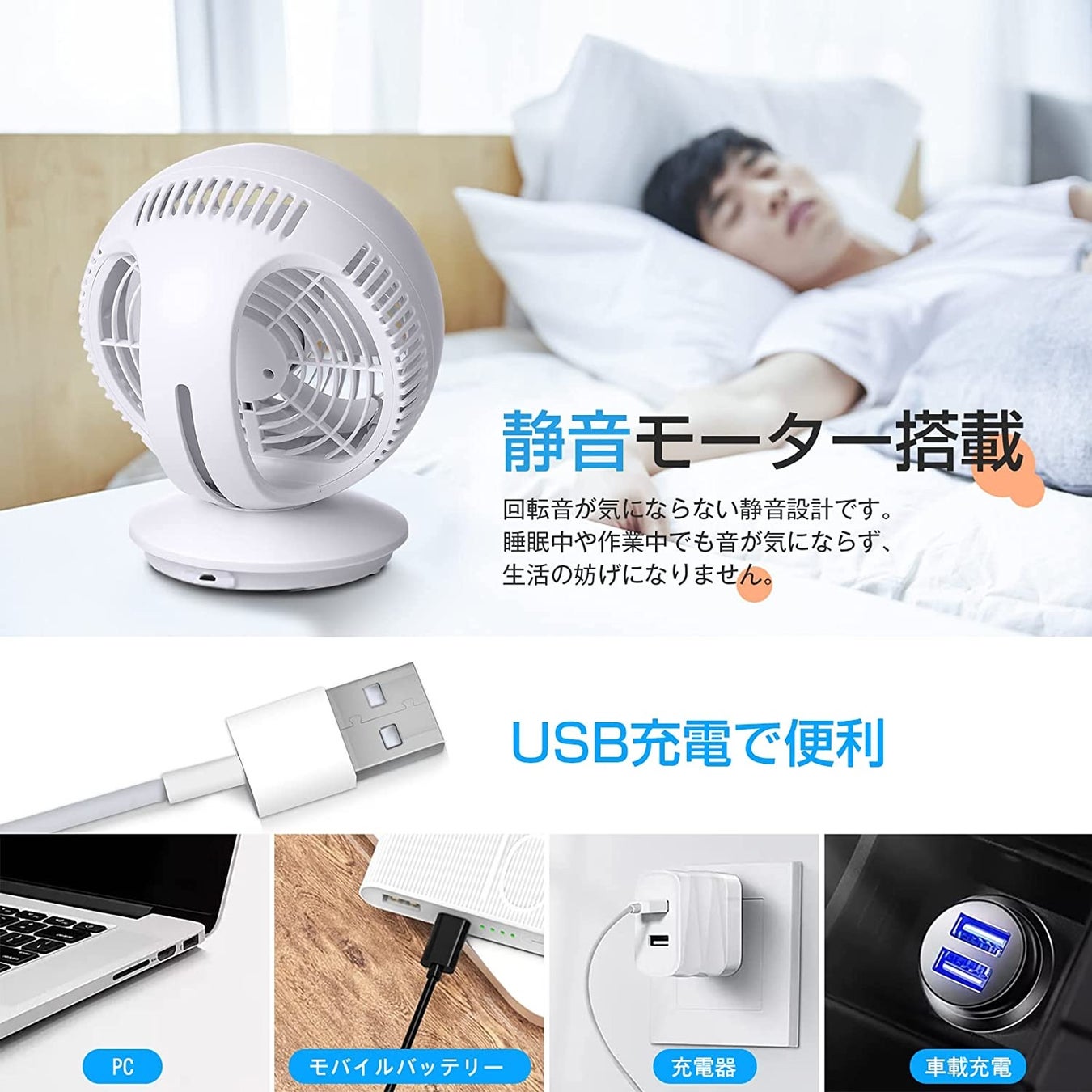 - DCモーター静音設計&USB充電式
