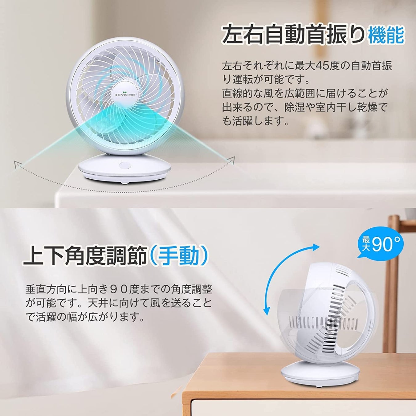 首振り機能搭載で、左右に自動で風を送れる便利な仕様となっています。上下90度に角度を変更することも可能、さらに広範囲に風を届けてくれる。空気循環をより良く促進します。