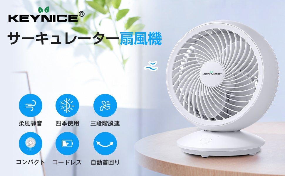 簡単お手入れKEYNICE新たな多機能コードレスタイプのサーキュレーター 、デスクの上はもちろん、キッチンなどコンセントから電源が取れない場所でも活用できます。5枚大きい羽根、風力は3段階で切り替え可能します。ギフトやプレゼントに最適で、ご家族やお友達、恋人へのプレゼントとしてもオススメです。