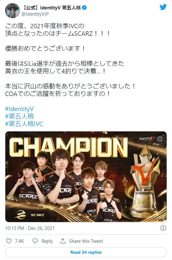 10月29日から12月26日の約2か月間行われた『2021 FALL IdentityV Championship(IVC)』SCARZ 第五人格部門所属の選手達が本大会に出場し、チーム初となる日本一位を獲得致しました。