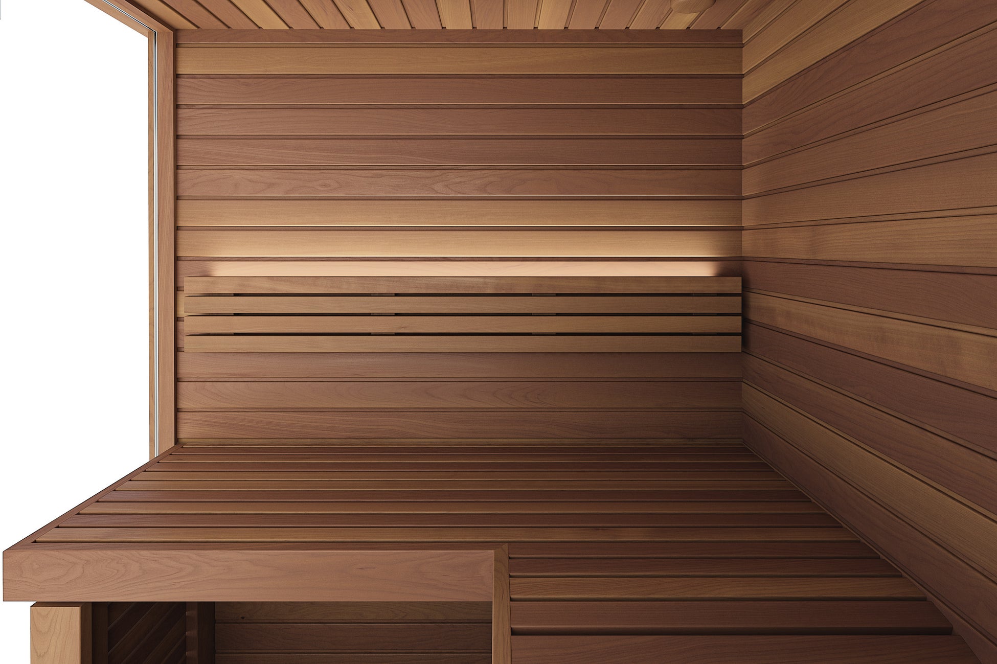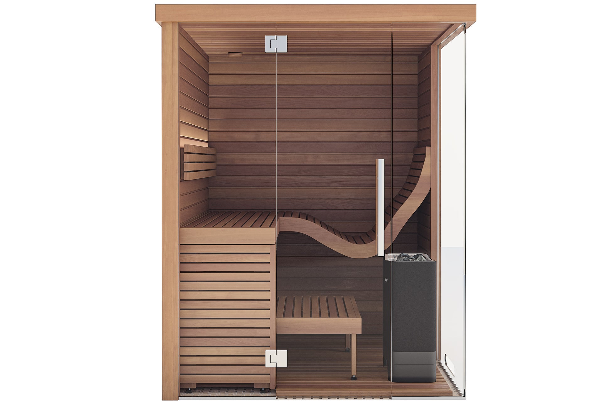 最大の特徴は人間工学に基づいたベンチとなっており、足が暖まりにくいサウナ室内において、無理のない姿勢で全身を満遍なく温めることができます。北欧では疲労回復を目的に、サウナの柵に脚を置いて足元までくまなく温めるアスリートが多くなっています。このエルゴノミクスベンチでは、そういった温熱効果を無理ない姿勢で獲得することが可能です。