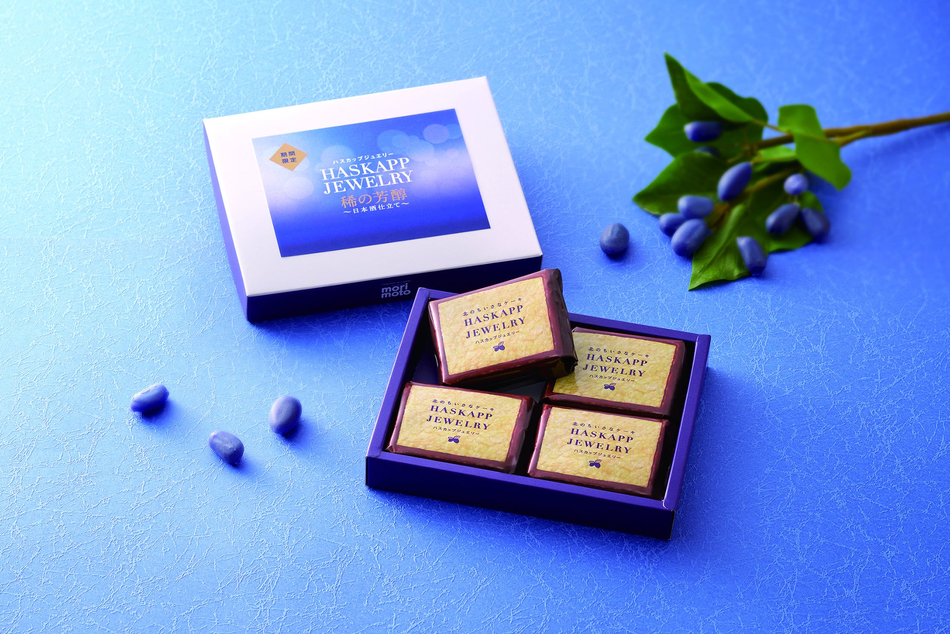 北海道特産の果実である「ハスカップ」は、希少性の高さと群青色の見た目から‟青の宝石″のような輝きを放ちます。この実で作るジャムとバタークリームを薄焼きクッキーでサンドした、もりもとのロングセラー商品「北のちいさなケーキ ハスカップジュエリー」に北海道の寒冷な大地が育んだみずみずしい味わいの日本酒「吟風國稀」を掛け合わせた「ハスカップジュエリー稀の芳醇~日本酒仕立て~」が完成いたしました。