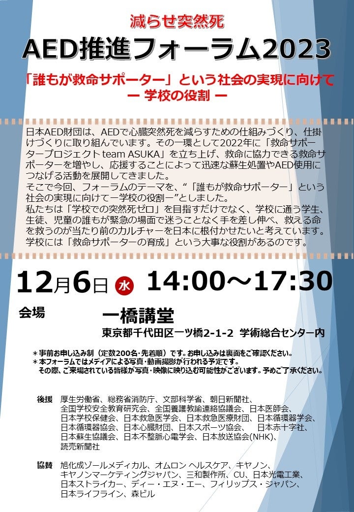 【参加者募集】減らせ突然死 AED推進フォーラム2023を開催いたします