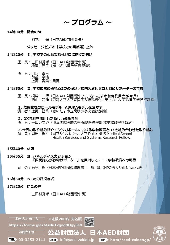 減らせ突然死 AED推進フォーラムを今年度も開催いたします。今年は『「誰もが救命サポーター」という社会の実現に向けて―学校の役割―』をテーマに、安心安全の社会を構築するための方策を議論します。