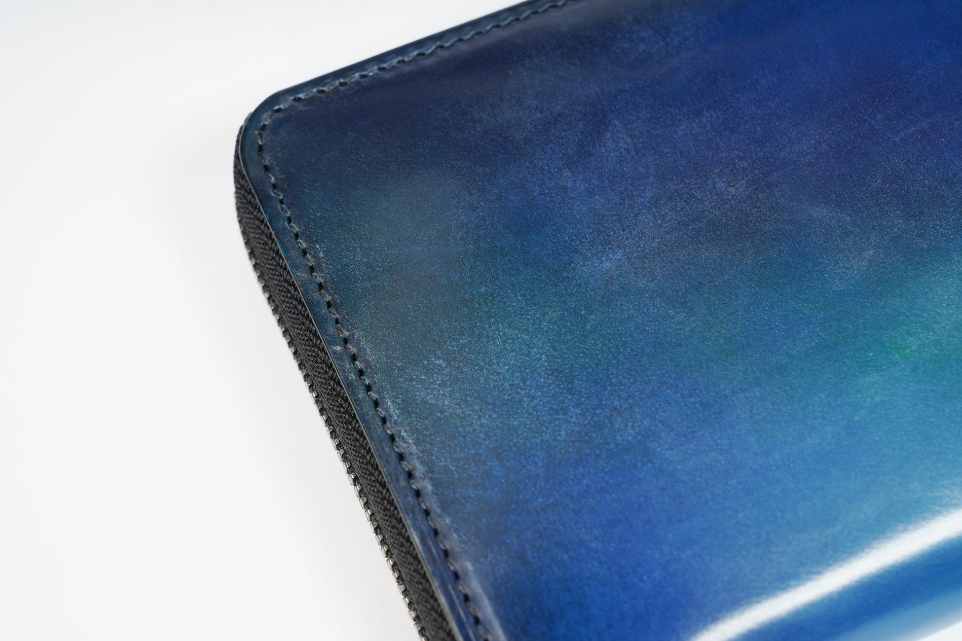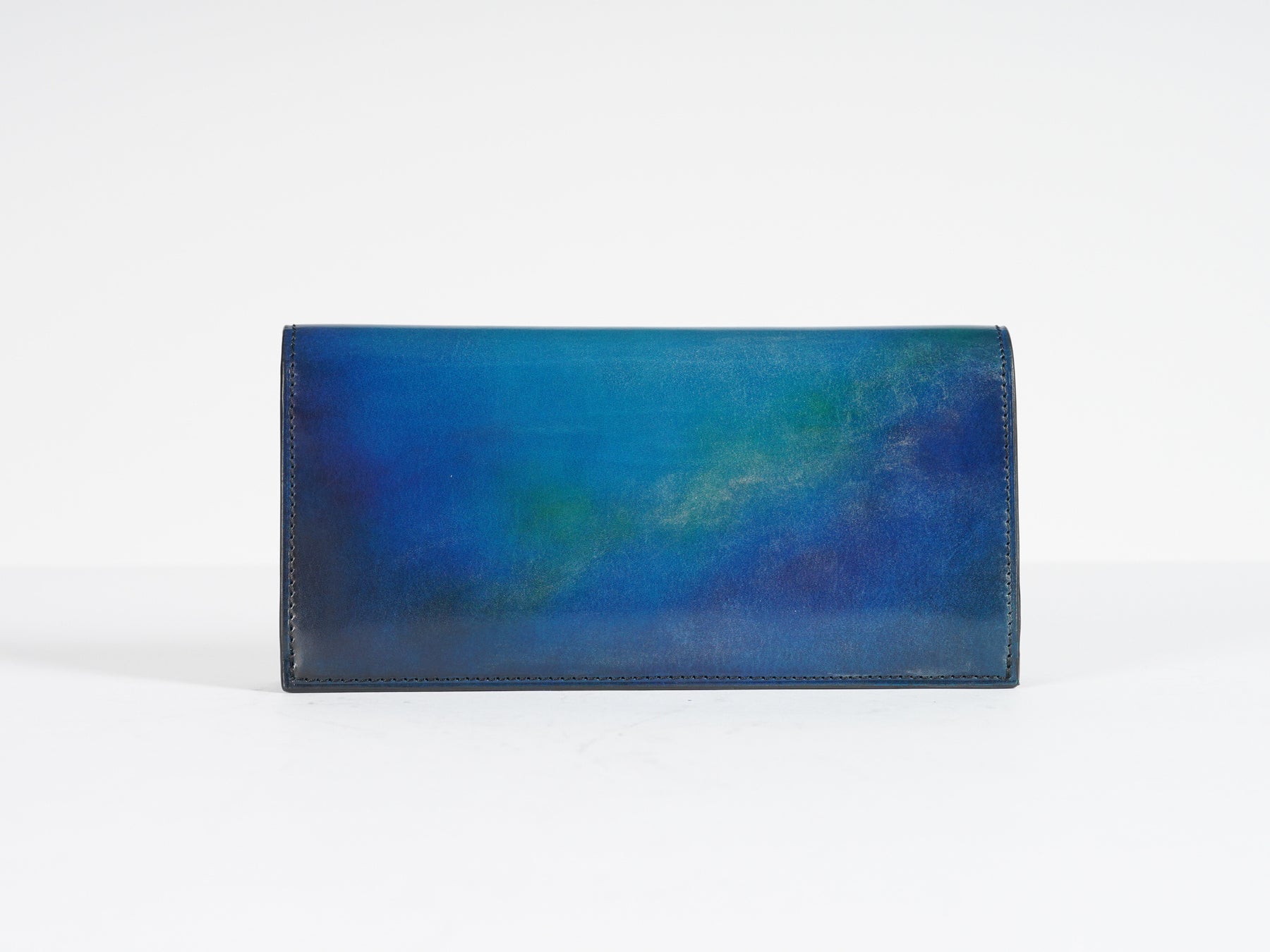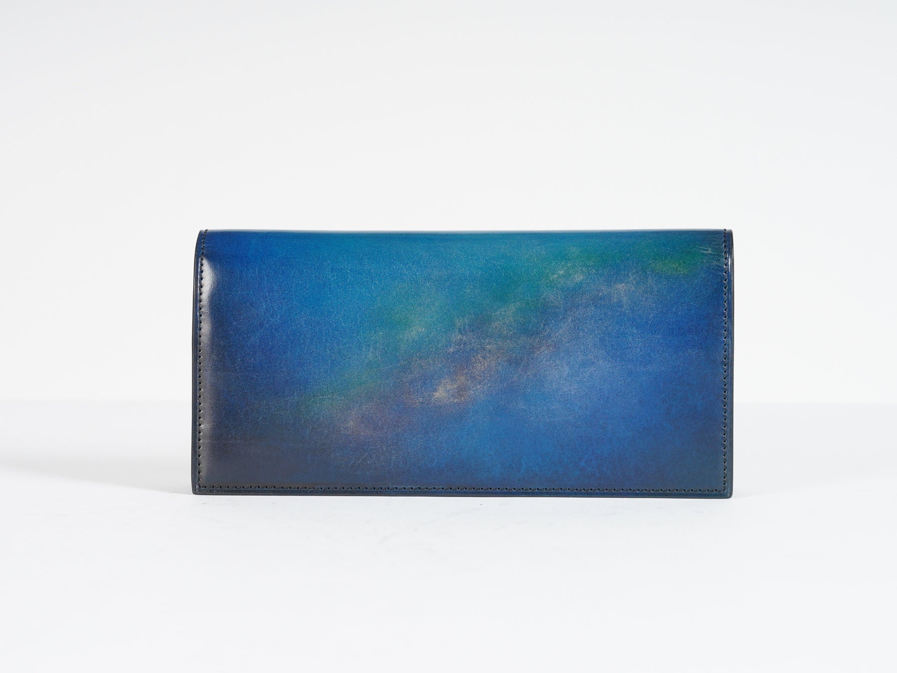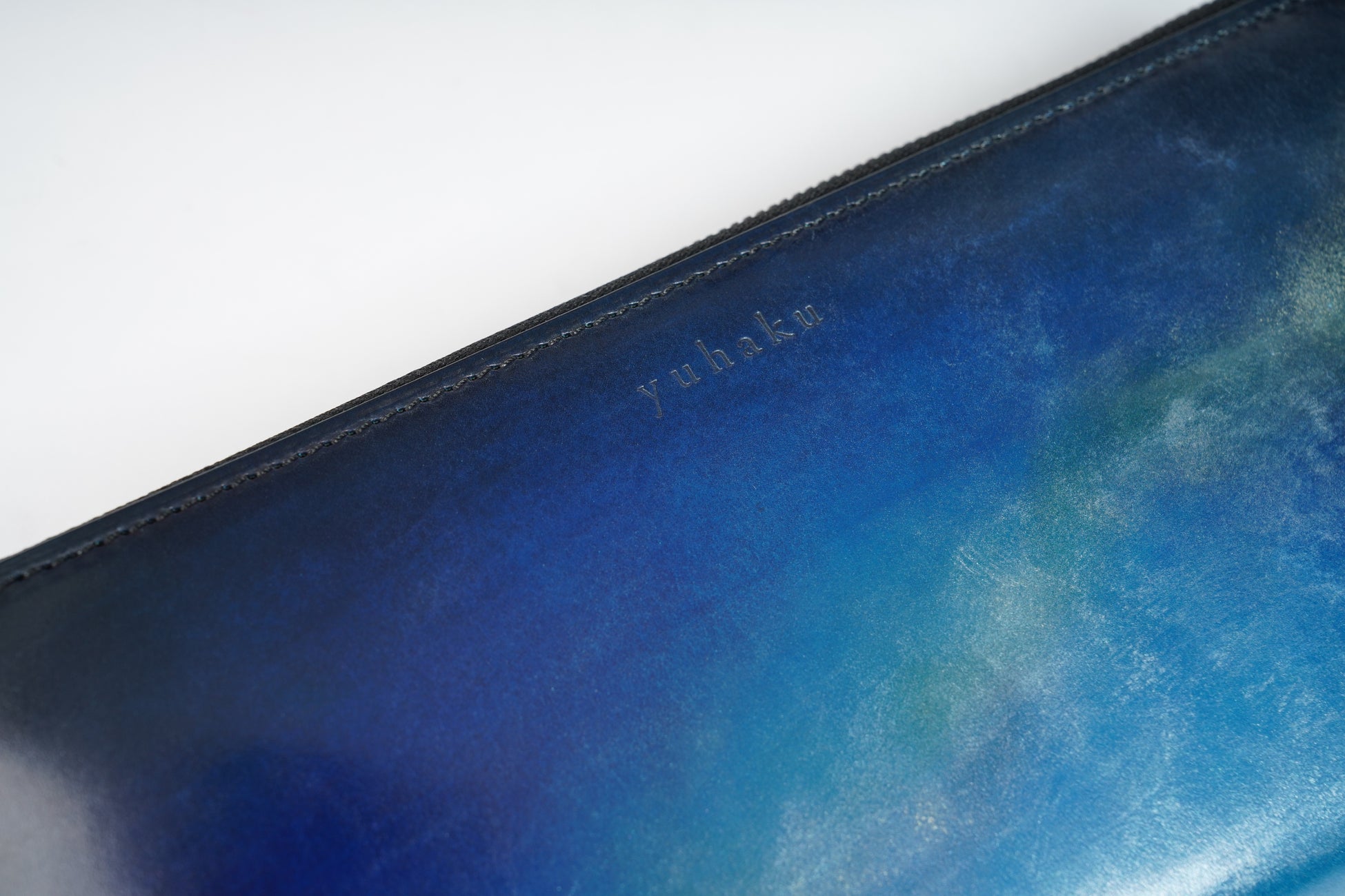 深い青に染め上げたきめ細やかなカーフスキンに、多様に変化する繊細な彩りをムラ染め。仕上げにパール顔料をあしらうことで、光の角度で表情を変える巳の鱗のような神秘的な色合いを生み出しました。