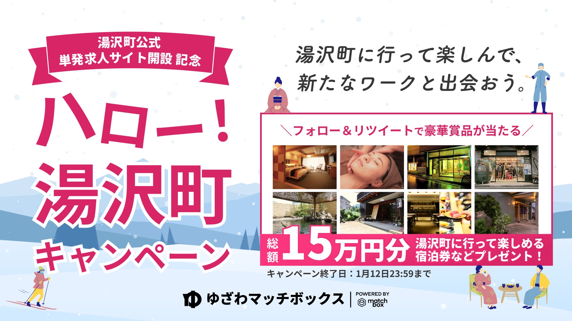 2022年7月、全国初となる「自治体公式」の単発求人サイト”ゆざわマッチボックス”が湯沢町で誕生しました。地元の方に限らず全国から湯沢町に来る方も、湯沢町で遊び、一緒に短期単発でお仕事も体験するという新しい体験が「ゆざわマッチボックス」で可能です。湯沢町で気軽に1日数時間からはたらけること、湯沢町の魅力をぜひ知ってもらいたい。そんな思いからTwitterフォロー&リツイートキャンペーンを開催いたします。