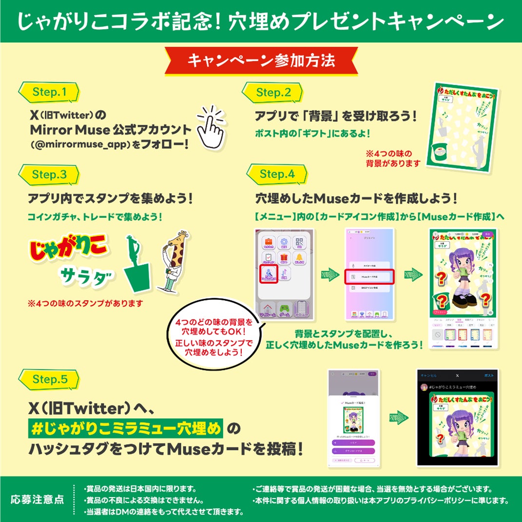 『@mirrormuse_app』をフォローしていただき、コラボ背景とスタンプを用いたて正しく穴埋めしたMuseカード画像と共にSNS「X」に『#じゃがりこミラミュー穴埋め』のハッシュタグをつけて投稿すると、抽選で10名様に「じゃがりこ サラダ」1ケース(12個)が当たる【じゃがりこコラボ記念!穴埋めプレゼントキャンペーン‼】も開催いたします。是非ご参加ください。