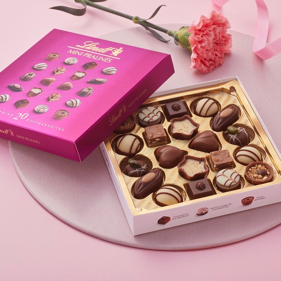 ミニチュアサイズのリンツの上質なプラリネチョコレート9種類の詰め合わせ。細部にまでこだわって作られた、1粒2cmほどの可愛らしいプラリネはつい見惚れてしまうほどの美しさ。ご褒美に少しずつ楽しめるのも魅力です。今だけ“THANK YOU”の文字が書かれたスリーブ付きの特別仕様で登場。普段は言えない感謝の気持ちを伝えるのにぴったりです。
