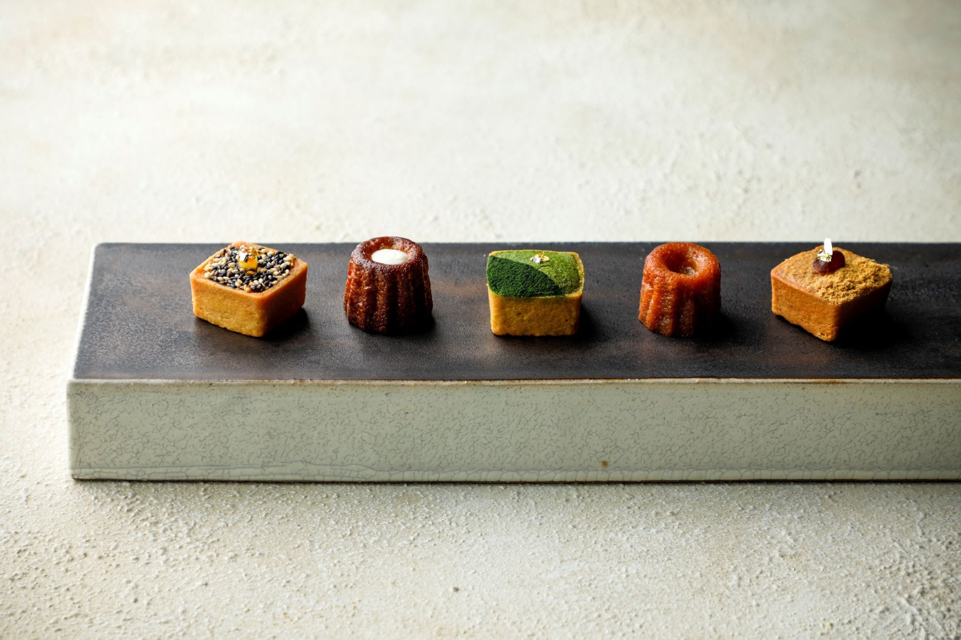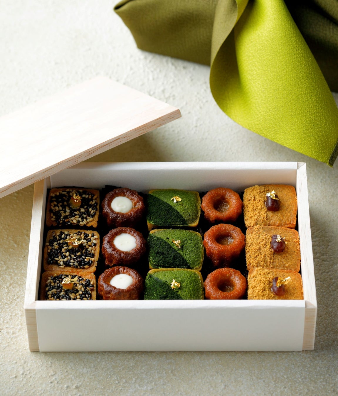 発売以来、人気を博してきた「焼き菓子の詰め合わせ」は、ひと口サイズの愛らしい3種のタルトと2種のカヌレが上品な佇まいの木箱に並びます。エグゼクティブペストリーシェフ松尾こだわりの京都・宇治のオーガニック抹茶に柚子を忍ばせた「抹茶柚子」、京都・丹波産黒豆の香ばしいきな粉と自家製餡が相性抜群の「丹波黒豆のきな粉と餡」から、爽やかな柑橘とゴマの風味が引き立て合う「蜜柑とゴマ」タルトなど、こだわりぬいた素材の風味を活かし、上品な味わいに仕上げています。