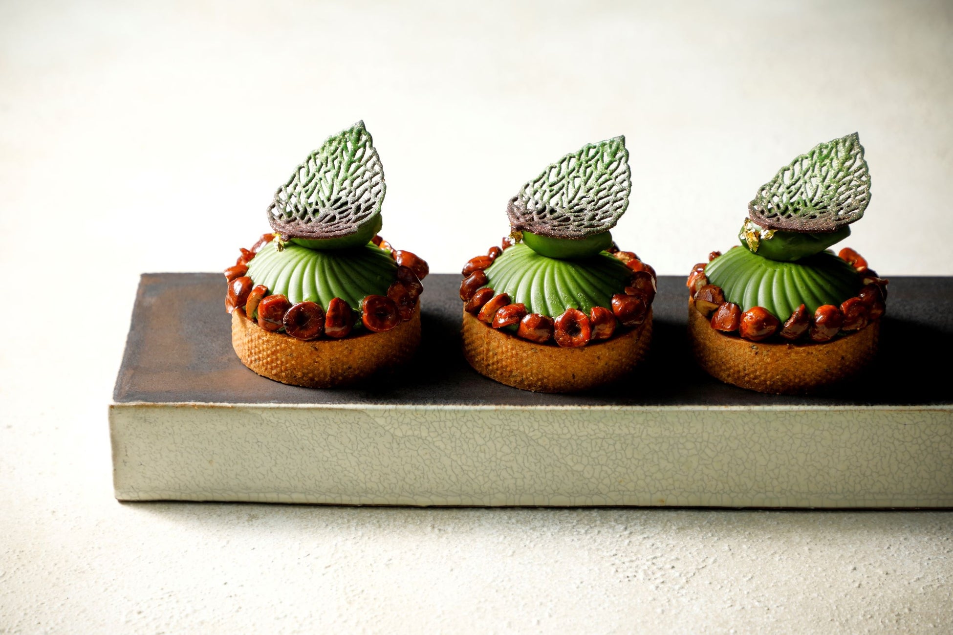 京都・宇治の標高368mの茶園で育った濃厚なオーガニック抹茶をふんだんに使用したタルト。ホワイトチョコレートと合わせた滑らかな抹茶クリーム、香ばしく焙煎したヘーゼルナッツのキャラメリゼ、チョコレート、カスタードとヘーゼルナッツのクリームを絞りました。5層に重なった味は、一口食べるごとに濃厚な抹茶の風味が広がり、絶妙なバランスを奏でます。キャラメリゼしたヘーゼルナッツの粒を周りに並べ、カリッとした食感もお楽しみいただけます。仕上げには、アマン京都の森の庭の新緑に見立てた愛らしい葉っぱと金箔を添えた、ポップアップイベント限定の逸品です。