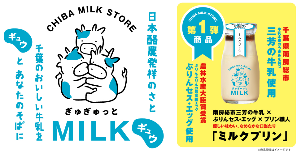 | 千葉の魅力を“ぎゅっ”とつめ込んだ商品をあなたのそばに。 『ぎゅぎゅっと MILK』 酪農発祥の歴史を持つ千葉が誇る「牛乳」を軸として千葉県産牛乳×千葉県特産品×千葉県の生産者をかけ合わせたオリジナルスイーツを展開していきます。 |