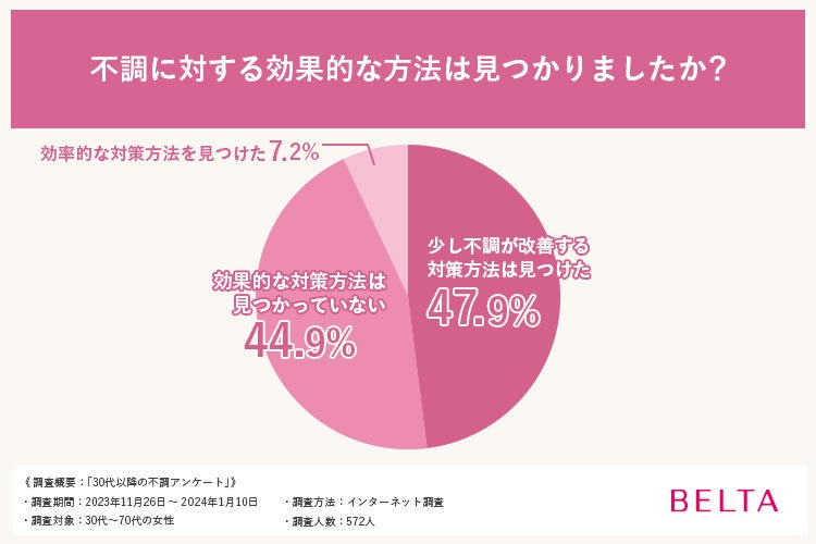 「不調に対する効果的な対策方法は見つかりましたか?」と聞いたところ、『効果的な対策方法を見つけた』と回答したのは全体のわずか7.2%にとどまりました。
