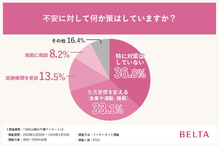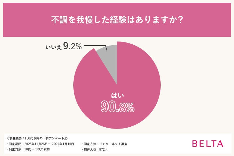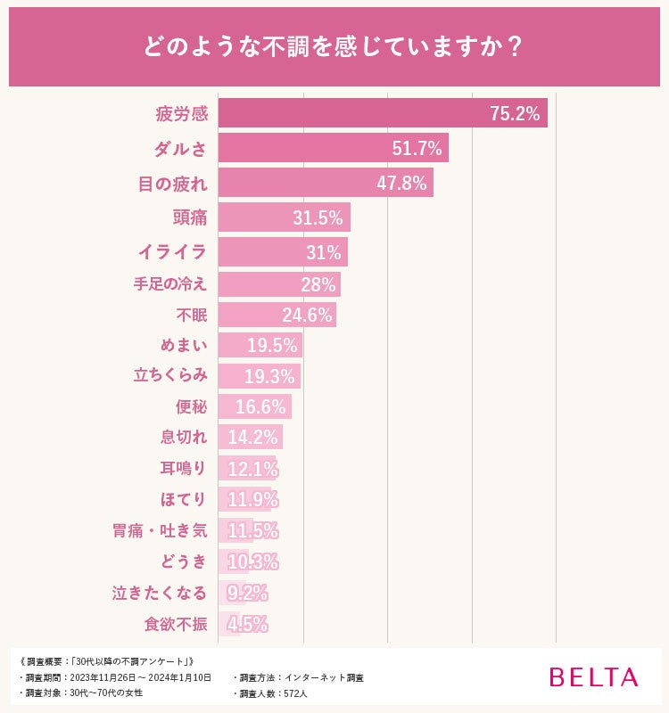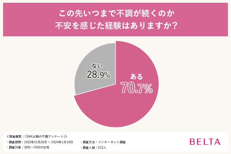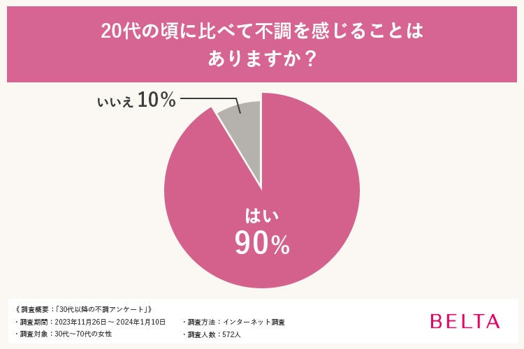 株式会社ベルタ(本社:東京都港区/以下ベルタ)が運営する女性ライフステージブランドBELTAは、30代〜70代の女性572名を対象に「不調」に関するアンケート調査を実施いたしました。本アンケート調査を通して「30代以降女性たちの不調に対する捉え方や対策」についての実態が明らかになりました。