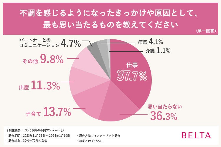 不調を感じている人を対象に「不調を感じるようになったきっかけや原因として、最も思い当たるものを教えてください」と聞いたところ『仕事(37.7%)』という回答が最も多く、『(不調を感じるようになったきっかけが)思い当たらない(36.3%)』『子育て(13.7%)』『出産(11.4%)』『その他(9.8%)』『パートナーとのコミュニケーション(4.7 %)』『病気(4.1%)』『介護(1.1%)』と続きました。