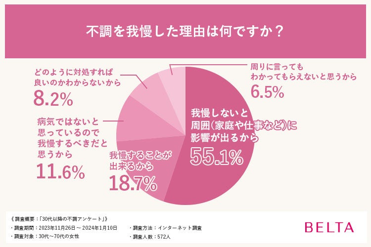 その理由について聞いてみると『我慢しないと周囲(家庭や仕事など)に影響が出るから(55.1%)』という回答が最も多く、『我慢することが出来るから(18.7%)』『病気ではないと思っているので我慢するべきだと思うから(11.6%)』『どのように対処すれば良いのかわからないから(8.2%)』『周りに言ってもわかってもらえないと思うから(6.5 %)』と続きました。