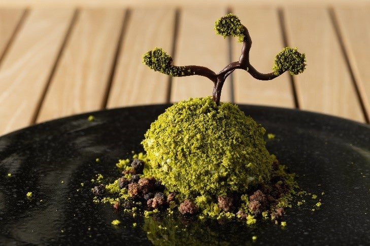アイスクリームにかかった抹茶味のグリーンパウダーが苔をイメージしており、枝部分はチョコレートで見立てています。