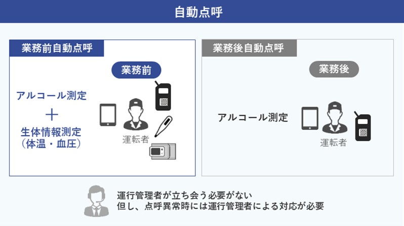 業務前自動点呼では、従来のアルコール検知や指示事項の確認に加え、体温・血圧等の生体情報を測定することで運転者の健康状態を定量的に把握し、運行の可否を判断することが新たに加わります。業務後点呼だけでなく業務前点呼も自動化することで、運行管理者が点呼のために営業所に待機する時間を大幅に削減できると期待されています。