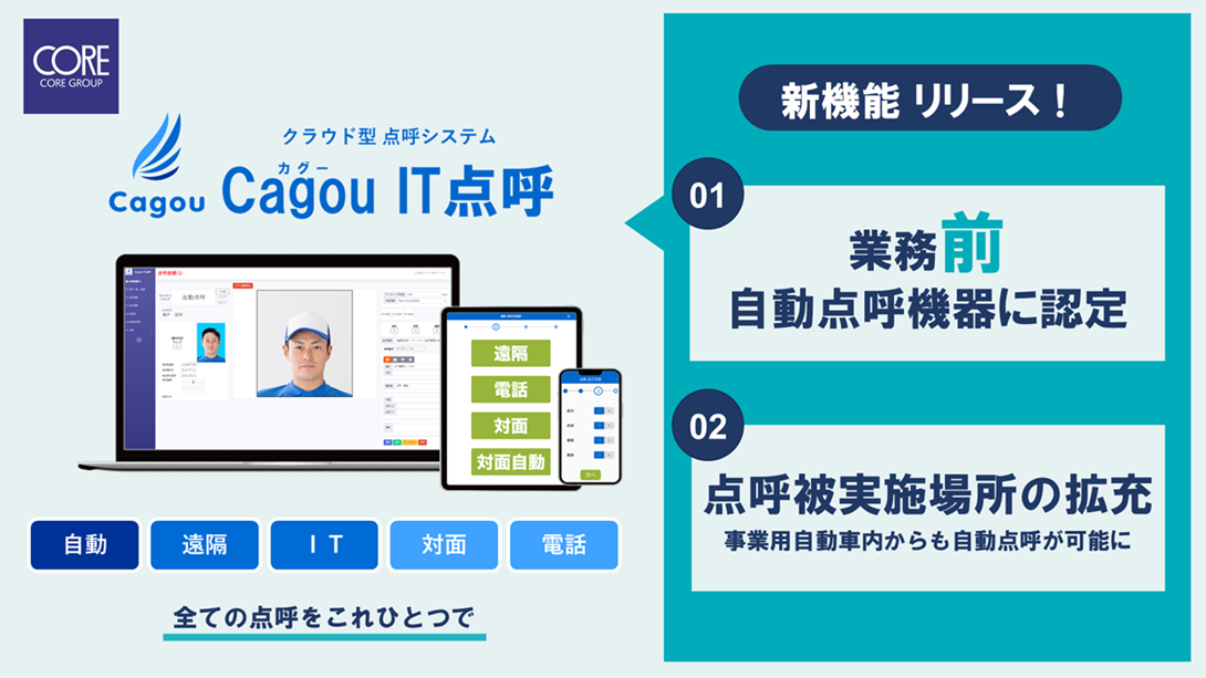 株式会社コア(本社:東京都世田谷区、代表取締役 社長執行役員 横山 浩二、以下「コア」という。)は、クラウド型点呼システム「Cagou IT 点呼」が業務前自動点呼機器として国土交通省より認定を受け、サービス提供を開始しましたことをお知らせいたします。併せて、業務後、業務前共に、「営業所および営業所の車庫」のほか、「事業用自動車内、待合所、宿泊施設、その他これらに類する場所」においても自動点呼が可能となりました。