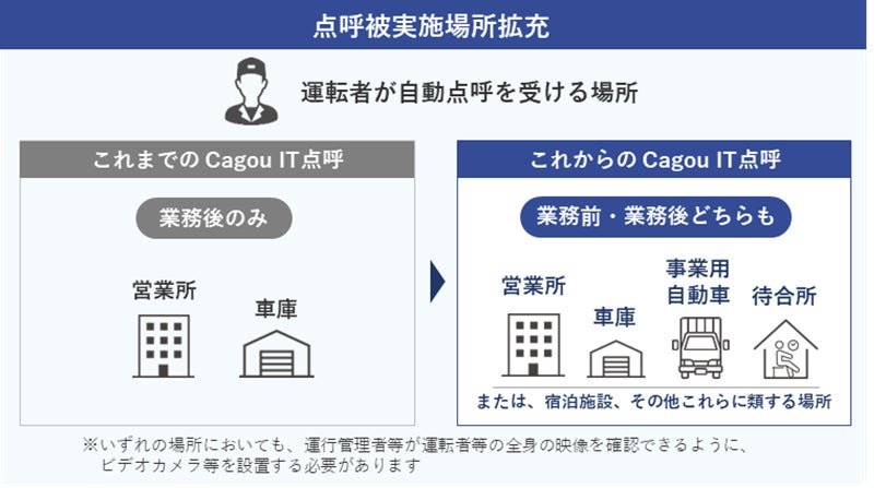 点呼システム「Cagou IT 点呼」新機能リリース 国土交通省認定:業務前自動点呼機能の提供開始と点呼被実施場所拡充のお知らせ