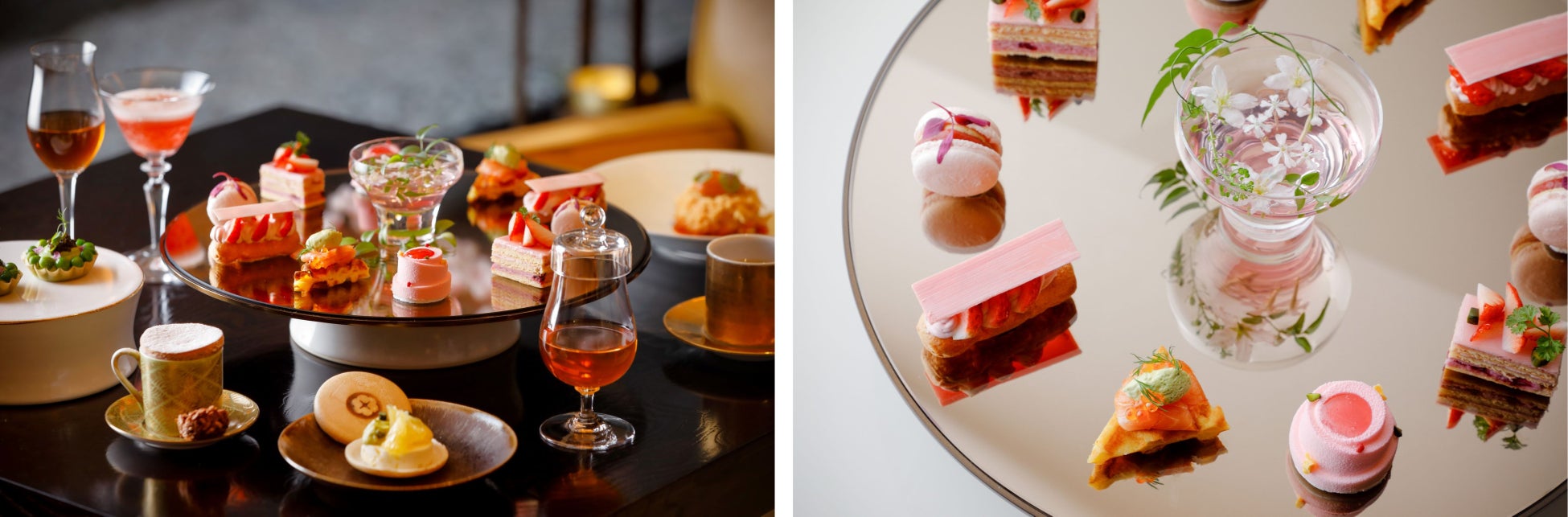 ホテルの中心部に位置し、寛ぎのひとときをお届けするラウンジ「ザ リビングルーム」。伝統的な京都の美意識にオマージュをささげた内装が美しい落ち着いたラウンジスペースで、非日常へと誘う優雅なひと時をお過ごしいただけます。桜アフタヌーンティーの期間中はふんだんに桜を配し、アフタヌーンティーを楽しみながら店内でのお花見が叶う、風情溢れるひとときをお楽しみいただけます。一品ずつ繊細に仕上げたセイボリー・スイーツをアソートスタイルでお楽しみいただけるブロンズミラーのティースタンド。桜の時季に旬を迎える食材を使用し、ビジュアル・味わいともに春の訪れを感じていただけます。桜が映り、桜色に染まるティースタンドは、この時期ならではのフォトジェニックな瞬間を演出いたします。他にない優美なアフタヌーンティーをぜひご堪能ください。