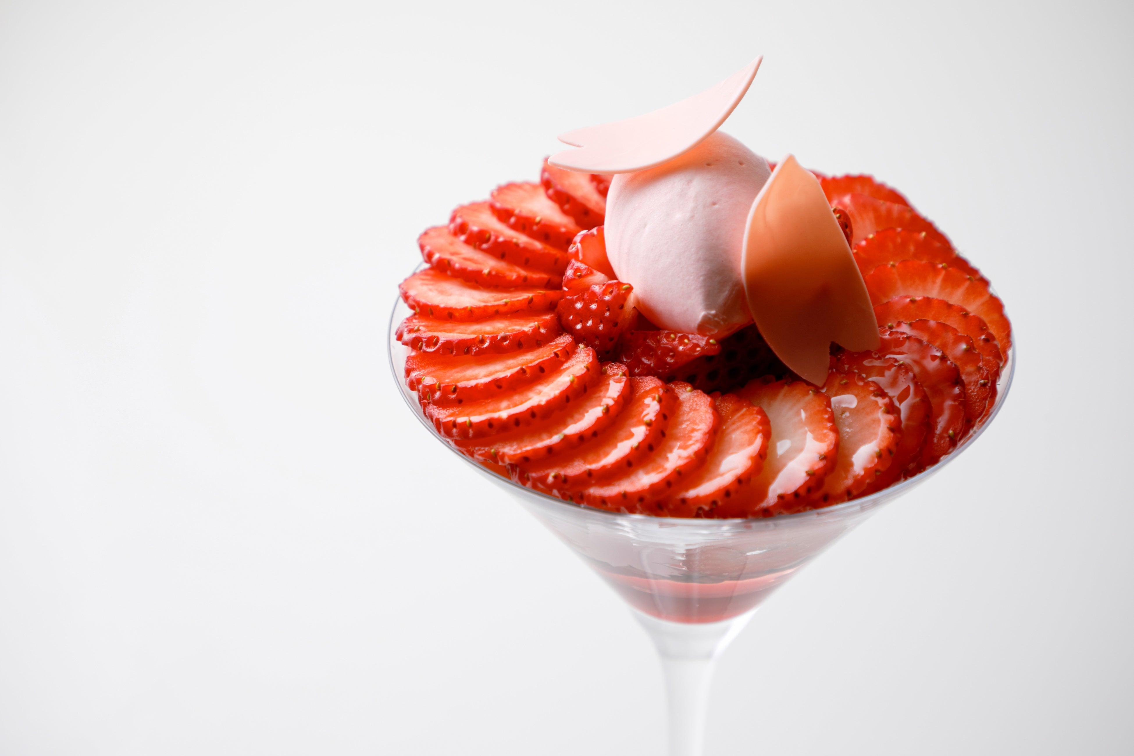 爽やかな桜のスパークリングジュレ、シャンティ、ピスタチオクランチ、いちごクリーム、更にピスタチオのジェラートを盛り込んだ贅沢なパフェ。その上には京都産のフレッシュな“あざといちご”のスライスをたっぷりとあしらい、ビジュアルにもこだわりが詰まった一品に仕上げました。側面からは桜型のクリームが顔をのぞかせ、360度どこから見ても、桜を想わせる繊細で美しい佇まいをご覧いただけます。いちごスライスの上には、ホームメイドの桜香るミルクジェラートを載せ、柔らかな春色が顔をのぞかせます。ペストリーシェフのこだわりが詰まった、口いっぱいに広がる春の味わいをぜひお楽しみください。