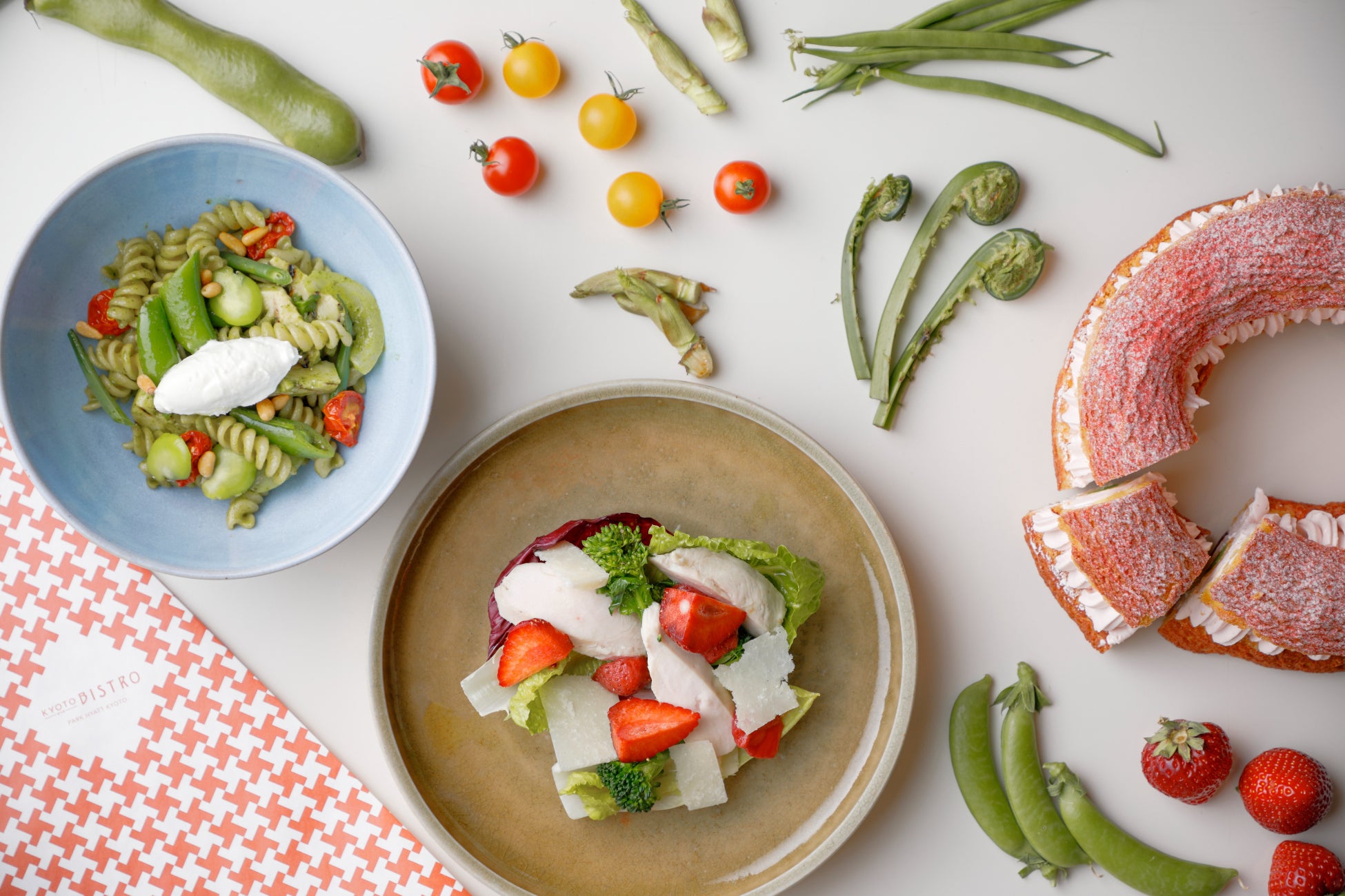 カジュアルな雰囲気の中、オープンキッチンで作り上げるシェフのこだわりのメニューをご提供するパーク ハイアット 京都のオールデイダイニング「KYOTO BISTRO」。厳しい冬の寒さを超え、初花の喜びから散り行く美しい落花の頃までの、穏やかな桜の季節をお祝いするコースメニューをご提供いたします。京都の風情溢れる“ねねの道”、 桜舞い散る一年坂の石畳を軽やかに進んだ先、二年坂を眺めながら古都の情趣を味わう絶好のロケーションに位置する「KYOTO BISTRO」で、春の食材をふんだんに取り入れたヘルシーながらも心華やぐ春のメニューをご堪能ください。
