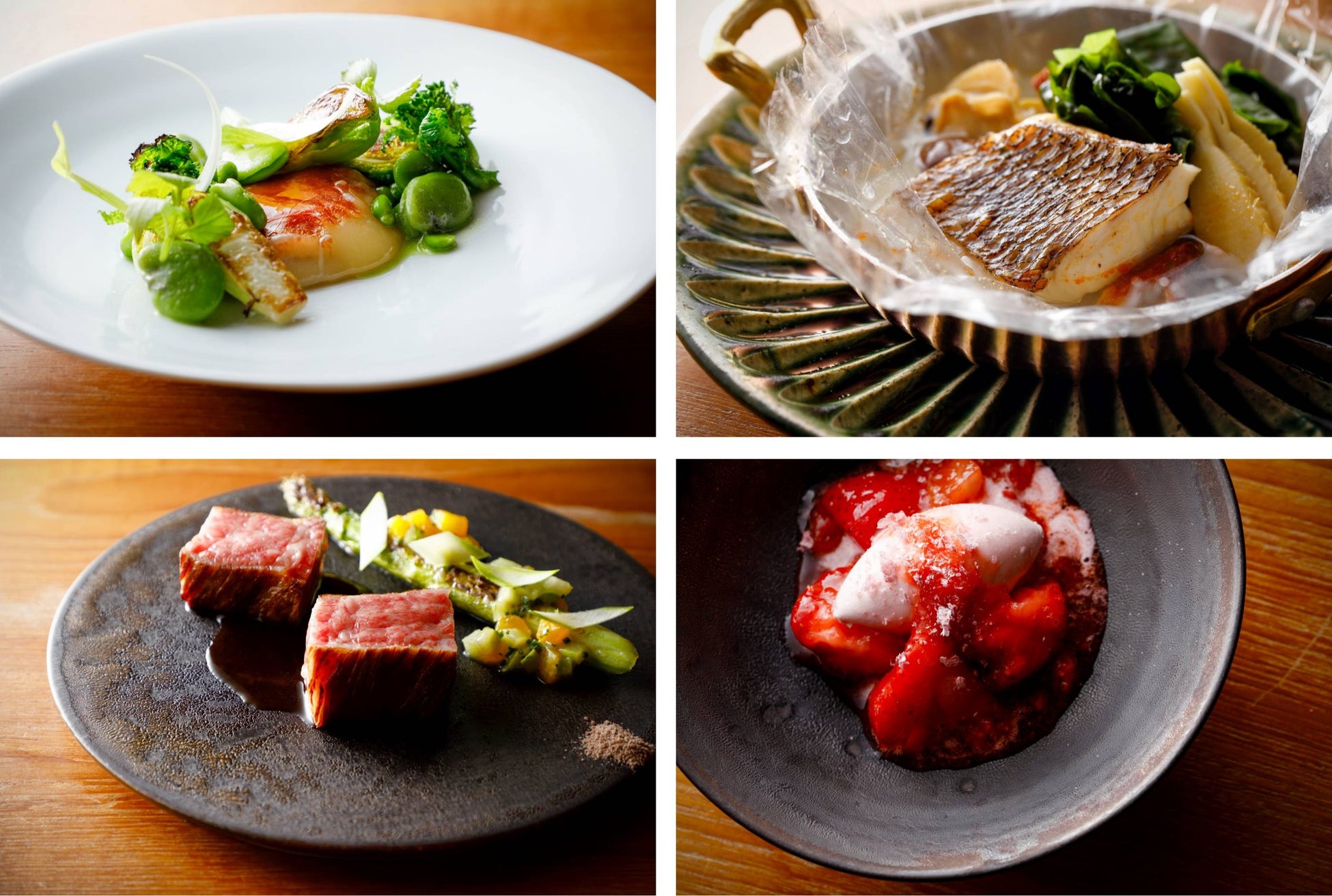 熟成させ燻製して風味付けをした国産の「カチョカバロ」を、表面は香ばしさを保ちながらもトロトロに焼き上げ、チーズの美味しさを最大限に生かす技法でお届けする一品。目の前で溶けだすチーズの香りが食欲を掻き立てる、まさにコースのはじめに相応しい前菜をご用意いたします。芽キャベツ・つぼみ菜・菜の花といった春を告げる食材は、それぞれを絶妙の焼き加減に火入れし、レモンのヴィネグレットでマリネして爽やかな仕立てに。空豆・えんどう豆はハーブバターで和えることによって春の食材が持つ爽やかな旬の味わいをより一層豊かな風味に仕上げます。最後に火入れしたうるいを添え、桜の季節に芽吹く食材の生命力を感じる芸術的な一品です。