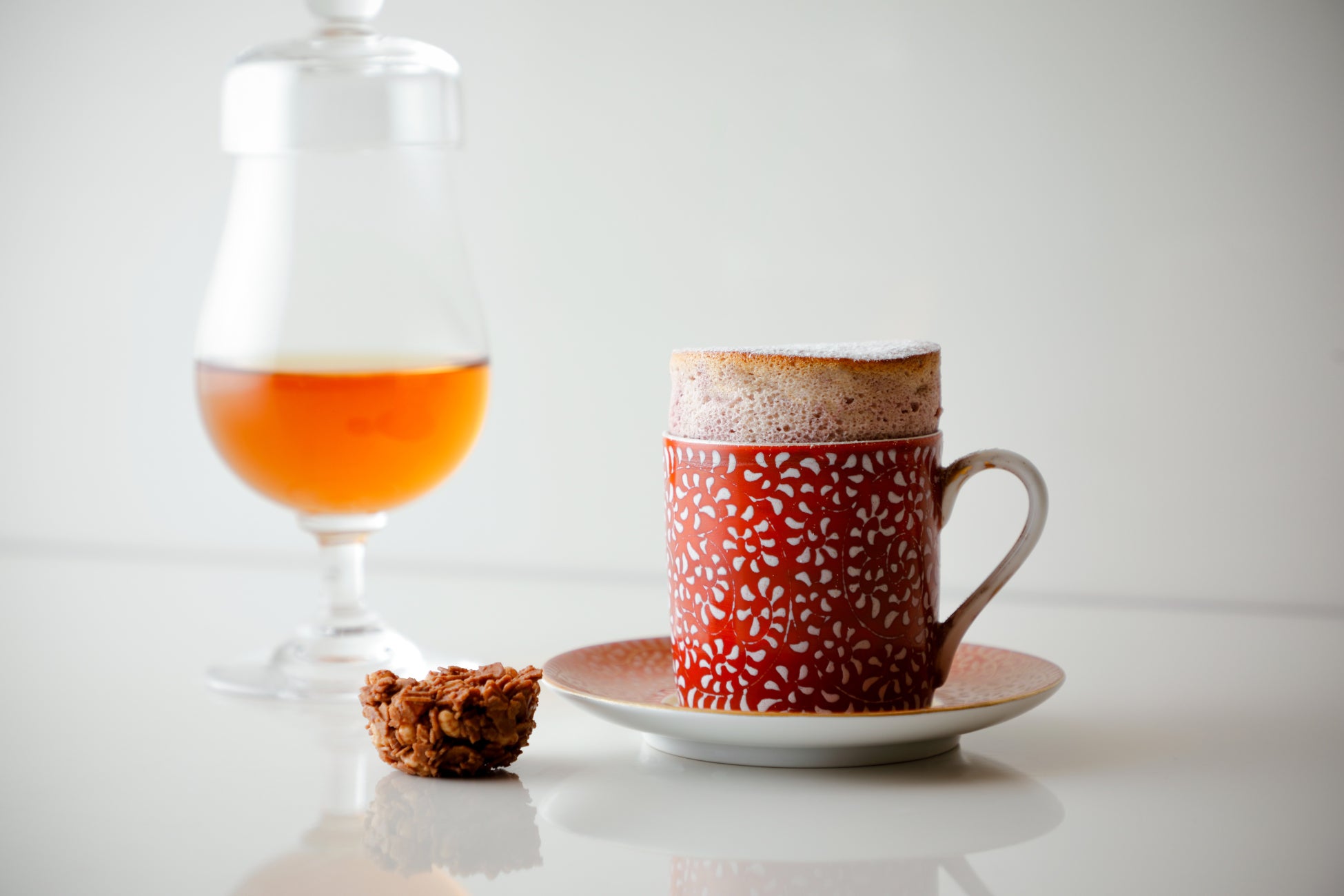 桜とグリオットチェリーを煮詰めて濃縮させた特製シロップをメレンゲにあわせて軽やかに焼き上げました。口に入れた瞬間のふわふわとした食感のあとに溶けてなくなるしゅわしゅわとほどける口溶けに仕上げた、絶妙な焼き加減をお楽しみいただけます。焼きたてでお持ちする温かいホットデザートです。出来立てでないと美味しさが伝わらないスフレをあえてアフタヌーンティーのメニューに取り入れた、ペストリーシェフの想いのこもったスイーツです。ほのかな甘みとざくざく食感にときめく付け合わせの桜ロシェもあわせてご堪能ください。