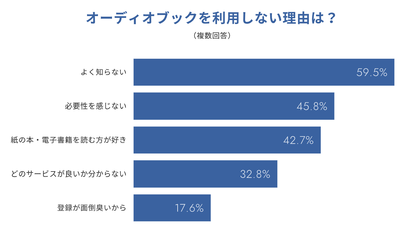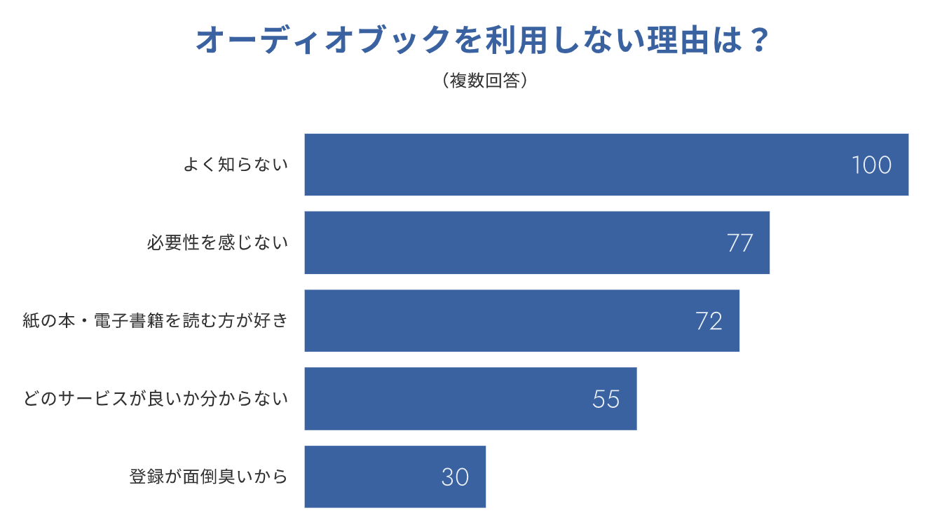 オーディオブックの存在は知っているが詳しくは知らない人が多く、あえてよく知らないサービスを自分から利用しにいくことはハードルが高く、利用しないという結論に至っているようです。