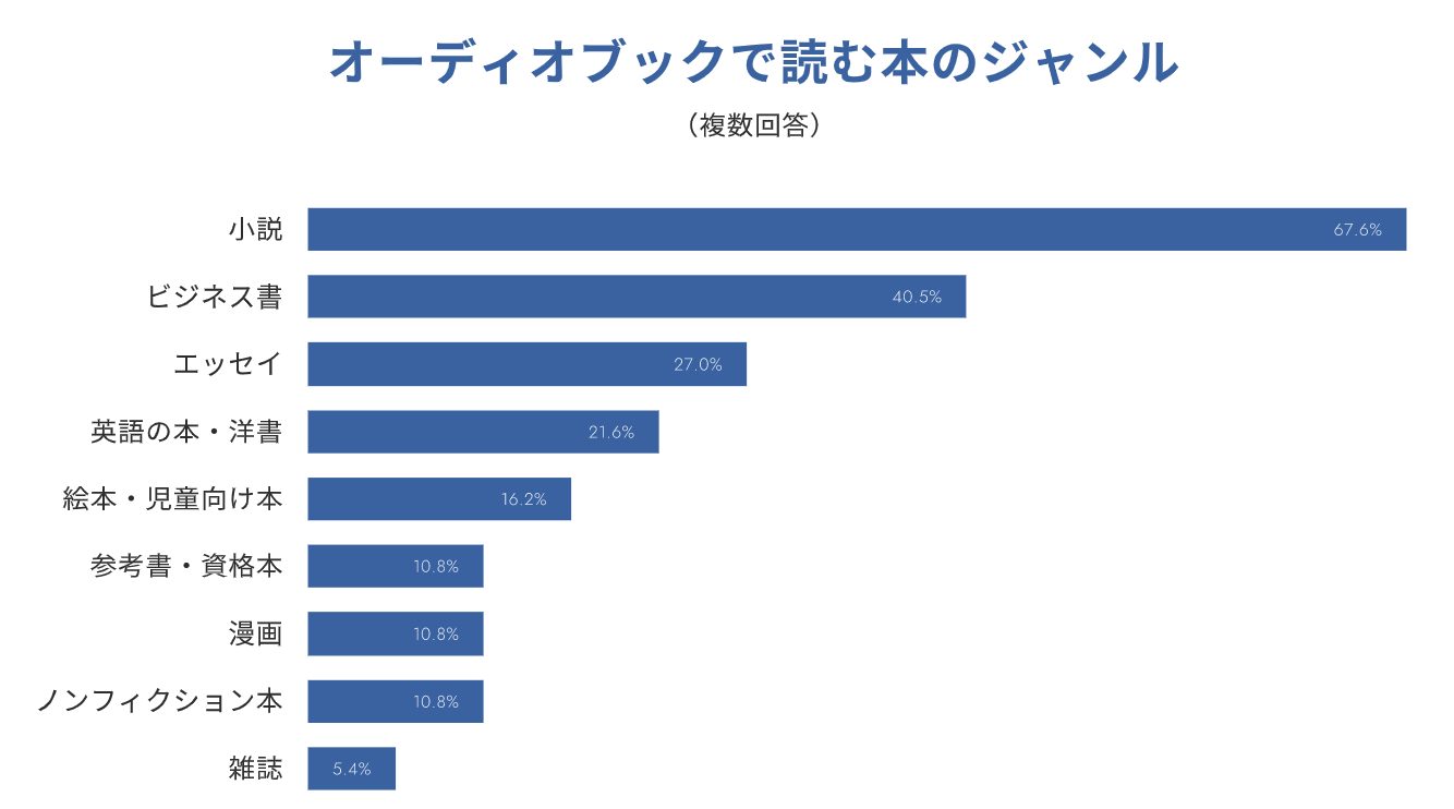 まず、オーディオブックでどんなジャンルの本を読むのか尋ねたところ、以下のような結果となりました。