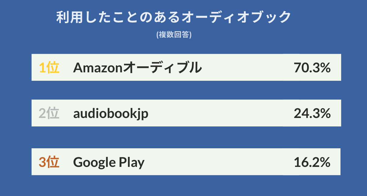 利用率が高いオーディオブックはAmazonが提供する「オーディブル」となりました。次いで2位が「audiobookjp」(株式会社オトバンク運営)、3位が「Google Play」(Google社運営)という結果に。