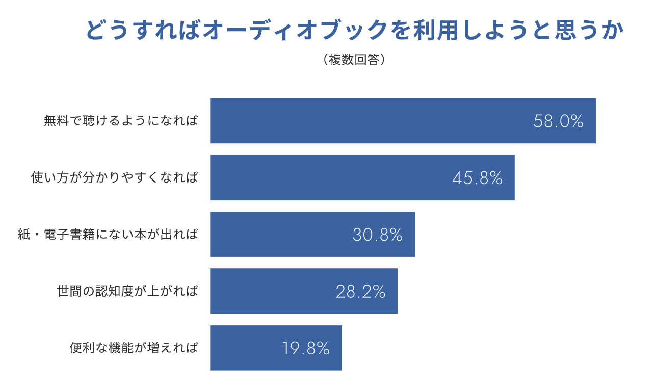 実際に現段階で無料で聴ける本はオーディオブックにあり、それも踏まえるとやはりオーディオブックの実態を「知らない」こと、「分かりやすくない」こと、「認知度がない」ことが一番のハードルとなっていることが分かります。