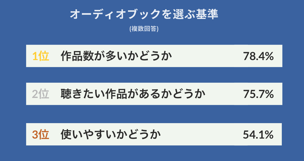 そして上記で挙げられた「オーディブル」を利用する人の意見は、「オーディオブックをどのような基準で選んでいるのか」を尋ねたアンケート結果とも一致しました。