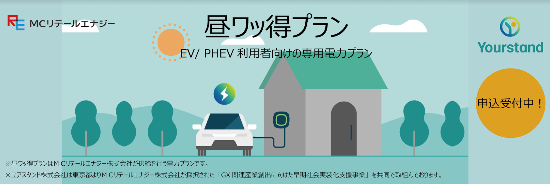 ユアスタンド株式会社(東京都品川区、代表取締役社長:浦 伸行 以下:ユアスタンド)は、МCリテールエナジー株式会社(東京都千代田区、代表取締役社長:田中 浩平 以下:МCリテールエナジー)と、家庭用(戸建て向け)のEV充電器の遠隔制御をおこなうことで、お客さまに効率的な充電環境を提供するМCリテールエナジーの新たな電力プラン「昼ワッ得プラン(ひるわっとくプラン)」の提供を2024年10月1日に開始しました。