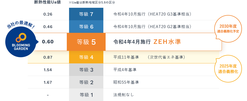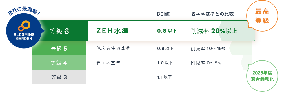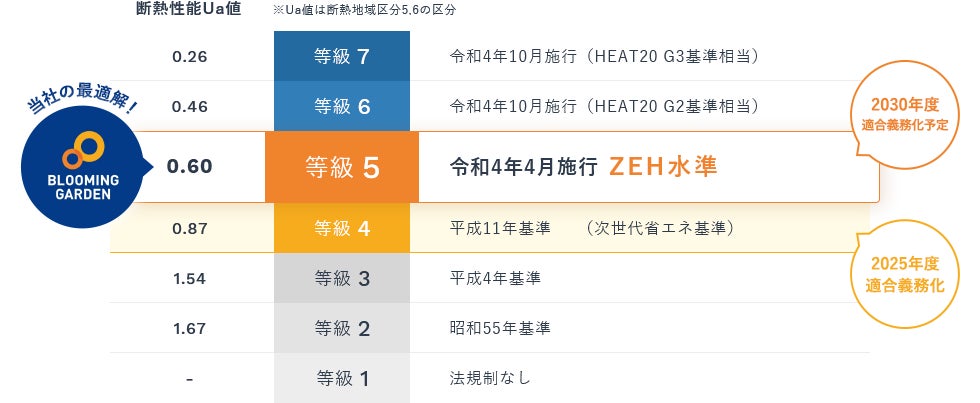 東栄住宅のブルーミングガーデンは断熱等性能等級5(ZEH⽔準)を全棟で取得。ブルーミングガーデンでは、2022年4⽉1⽇に等級5が新設されたことに併せて、これまでの等級4から「断熱等性能等級5」の基準に変更いたしました。