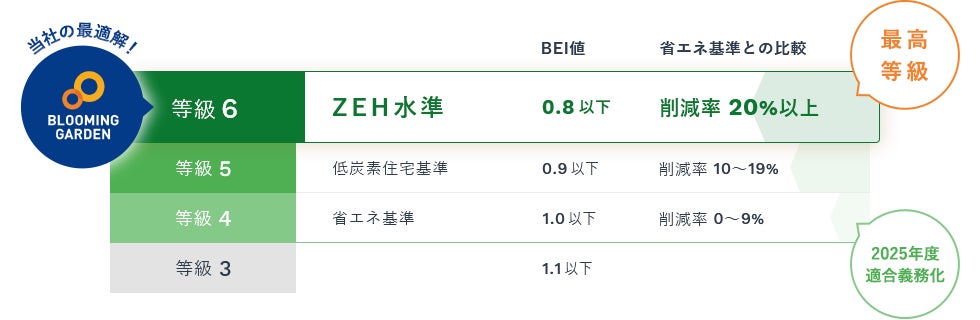 東栄住宅のブルーミングガーデンは⼀次エネルギー消費量等級6(ZEH⽔準)を全棟で取得。ブルーミングガーデンでは、2022年4⽉1⽇に等級6が新設されたことに併せて、これまでの等級5から「⼀次エネルギー消費量等級6」を全棟で基準としました。