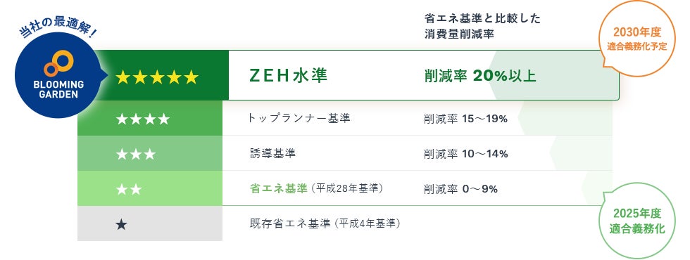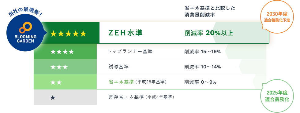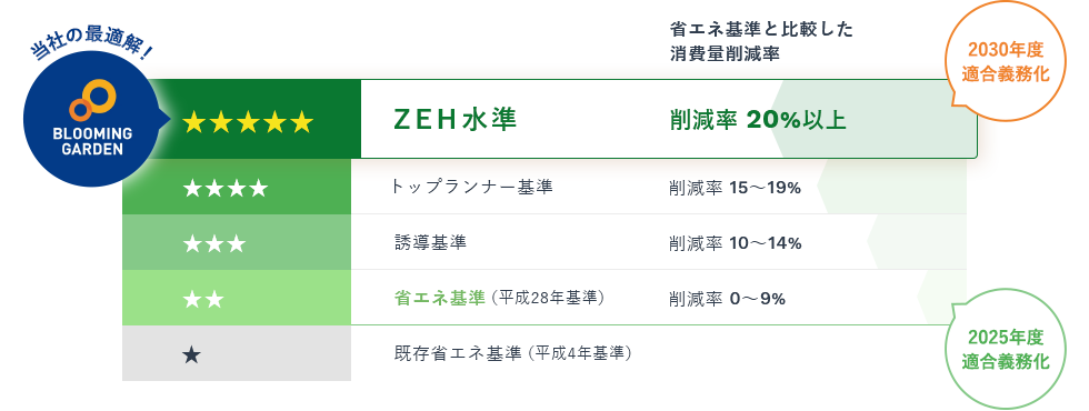 BELS評価では、省エネ性能を削減率を5段階で表示。「エネルギー消費の少ない住宅」かどうかがひと目でわかります。
