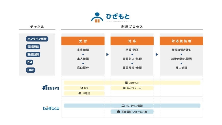 プッシュ型支援パッケージ「ひざもと」は、この電子行政サービスを利用しにくい理由となっている「使い方」をサポートし、「プッシュ型」サービスの展開を促進するBPOサービスです。綜合キャリアオプションのBPO管理クラウド「BENSYS」と、電話面談システム「ベルフェイス」を連動させ、利用者に寄り添いつつより効率的な行政サービスを実現します。