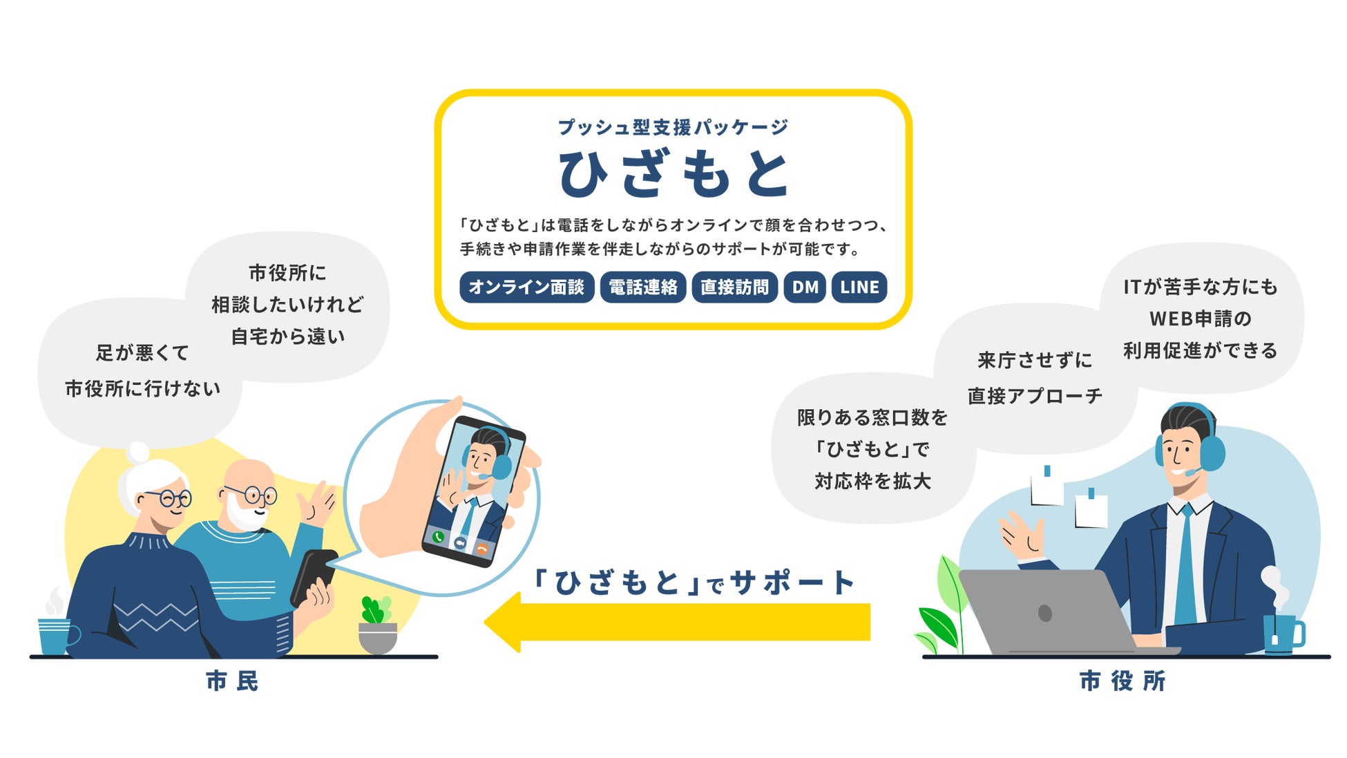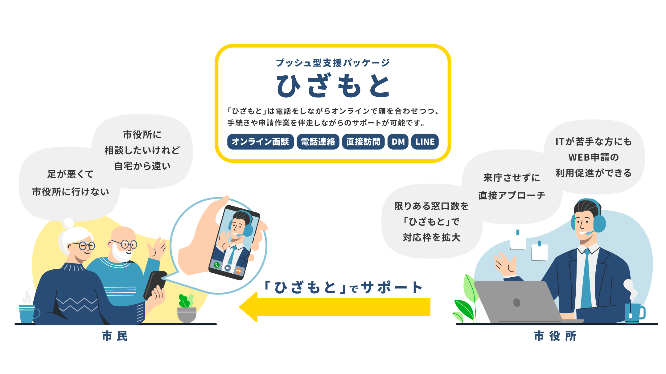 プッシュ型支援パッケージ「ひざもと」は、距離や時間の問題をオンライン面談スキームにより解決するだけではなく、サービス提供時における電子行政サービスを利用しにくい理由となっている「使い方」をサポートし、コールセンター側から電話→WEBへとシームレスに電子申請をできるようにするBPOサービスです。
