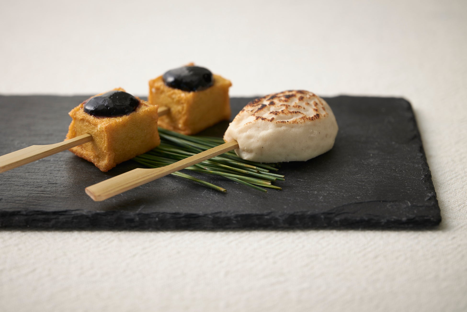 織田信長が日常の食事で好んで食べたといわれている、白身魚のすり身を使用して作られた焼き蒲鉾と生麩の田楽です。信長・秀吉・家康が尾張の八丁味噌を好んで食べていたことから、生麩の田楽には鉄火味噌を乗せています。