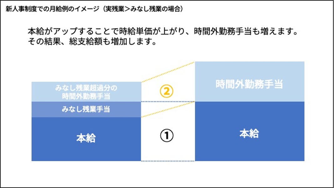 現在の当社のみなし残業手当は、役割等級制度(※1)のもと、等級ごとの役割給として支給しています。2024年度からの取り組みでは、この役割給(みなし残業手当)を本給に組み込むことで、みなし残業制度を撤廃し(※2)、勤務時間数に応じて時間外勤務手当を支給します(※3)。