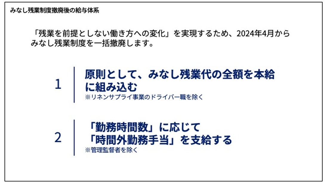 ※2リネンサプライ事業に従事するドライバーについては、みなし残業を残す方針