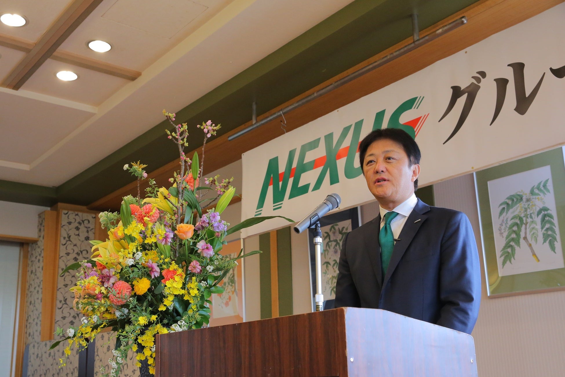 平成7年7月7日に創業を開始し、令和7年7月7日で30周年を迎えます。この節目の年に入社する皆さんには、新しい NEXUS をつくる人材として期待しています。私から皆さんには、「人生を楽しめ、そして輝け」という言葉を贈ります。そのためには目標を明確にすること、時間の大切さを理解すること、そしてあきらめないことです。皆さんが輝けば会社も輝きます。その若いチカラで一緒に作り上げていきましょう。」と祝辞を贈り、新入社員代表へ辞令を手渡しました。