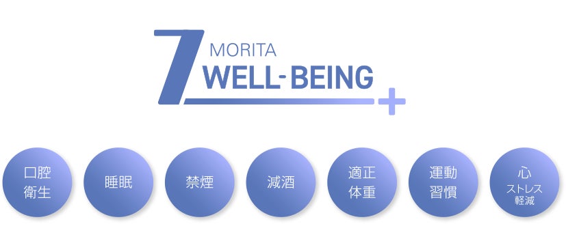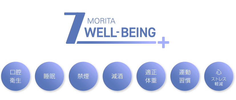 歯科健診、健康診断、ストレスチェック等の結果から、「7つの健康課題=MORITA 7WELL-BEING」を設定し、従業員の健康管理を行っています。特に口の健康と全身の健康と深いかかわりがあることを認識し、従業員の健康を維持向上させる施策のひとつとして、「歯科健診受診率100%」を掲げ、2014年度(4月1日~翌3月31日)から11年連続で達成しています。