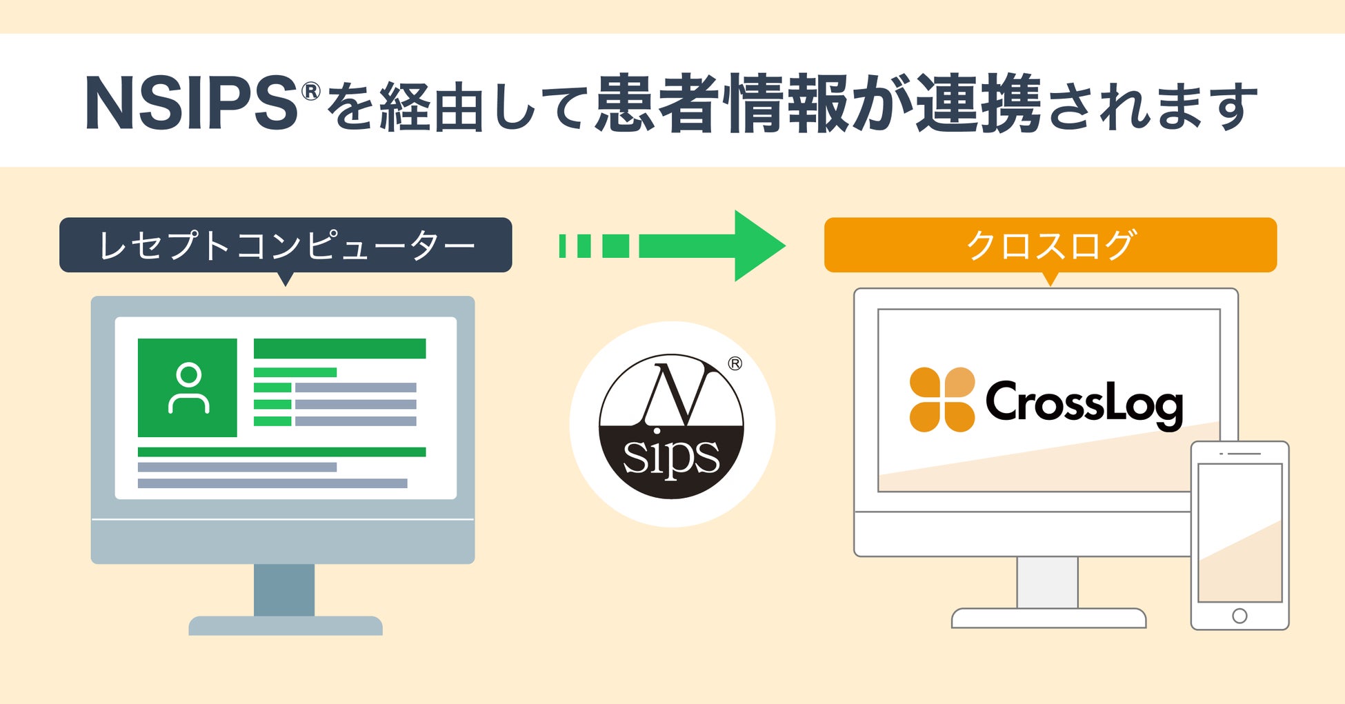 今回のNSIPS®連携機能の追加により、レセプトコンピュータに入力された患者情報(氏名、生年月日、住所、電話番号など)をクロスログに取り込むことが可能になります。これにより患者情報の二重登録の負担を削減し、訪問業務における事務作業の効率化を実現します。