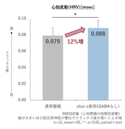 自律神経計を用いて、就寝前30分間深呼吸サポートデバイス「ston s(ストンエス)」使用条件は深い呼吸を実践した時点から就寝までの時間)の心拍変動(HRV)を解析しました。本検証では副交感神経系の活動状態を表すRMSSDというHRVの評価指標を採用しました。その結果、通常睡眠と比較して深呼吸サポートデバイス「ston s(ストンエス)」を睡眠前に使用した方が、有意に心拍変動が高いことが確認されました。これは副交感神経が優位になっており、リラックス度が高いことを示唆する結果です。