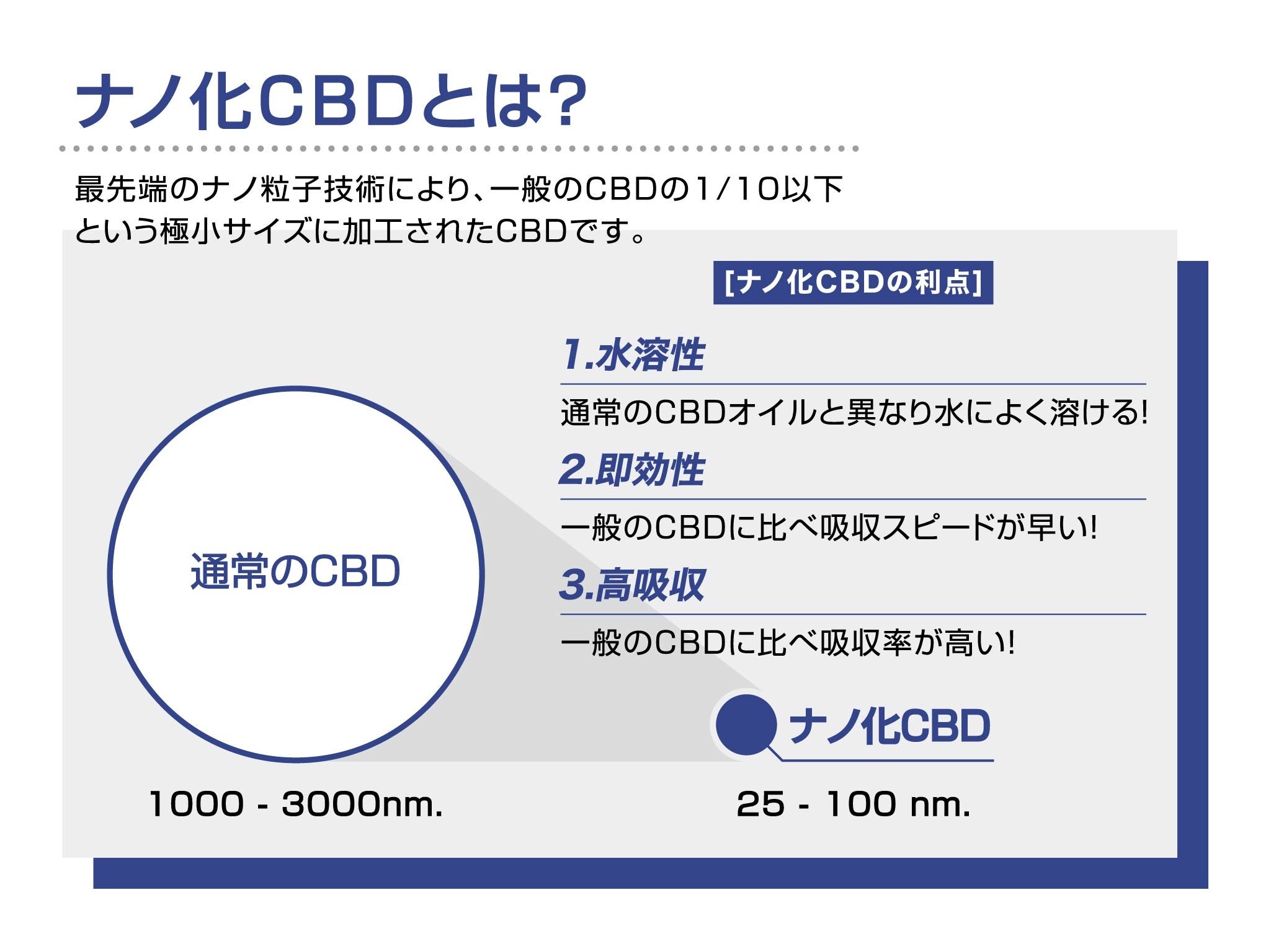 CBDアイソレートをナノ粒子技術を使い、10分の1以下のサイズに加工しています。これにより水溶性、即効性、高吸収を実現しています。